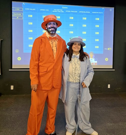 Andrea and I had a plan to surprise everyone. We disappeared for a bit, came back dressed as Harry and Lloyd from Dumb and Dumber, and walked into the conference room in full character. The room exploded with laughter. I’ve never seen smiles that big at a company event. It set the tone perfectly for the Jeopardy game that followed.